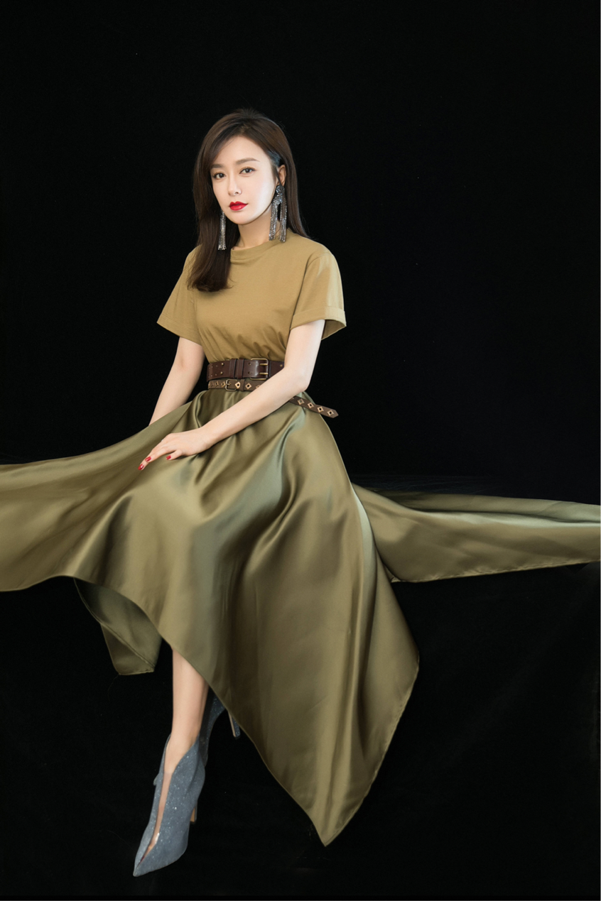 秦岚上身的浅绿色T恤搭配墨绿色半裙,整体上、下颜色相互呼应,层次分明的同时又让人感觉在强调同一色系。秦岚在穿搭时腰部选择了同时系上两条腰带,这样可以让人非常容易的注意到你腰部的位置,凸显她纤细小蛮腰的同时还有着非常良好的显高作用,显瘦又修身。