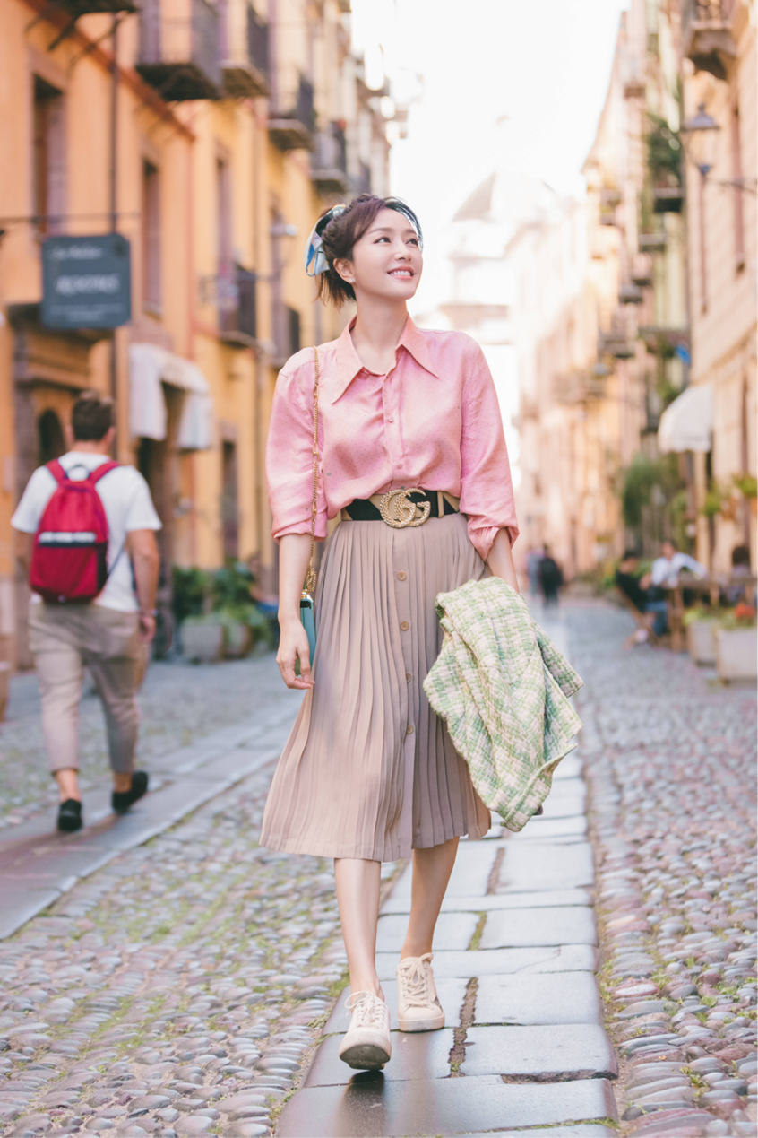 秦岚在衬衫与半裙的搭配中,选择了粉色衬衫给人清新又甜美的感觉,减龄效果非常好。上身这类饱和度和明度都较低的粉色,可以将你肤色显得非常白皙的同时凸显气色,对黄皮的仙女们来说非常的友好。再搭配一条纯色的百褶裙,这样不同材质的融合时髦个性,能为整体增添层次感的同时遮肉效果非常好,显瘦又好看。